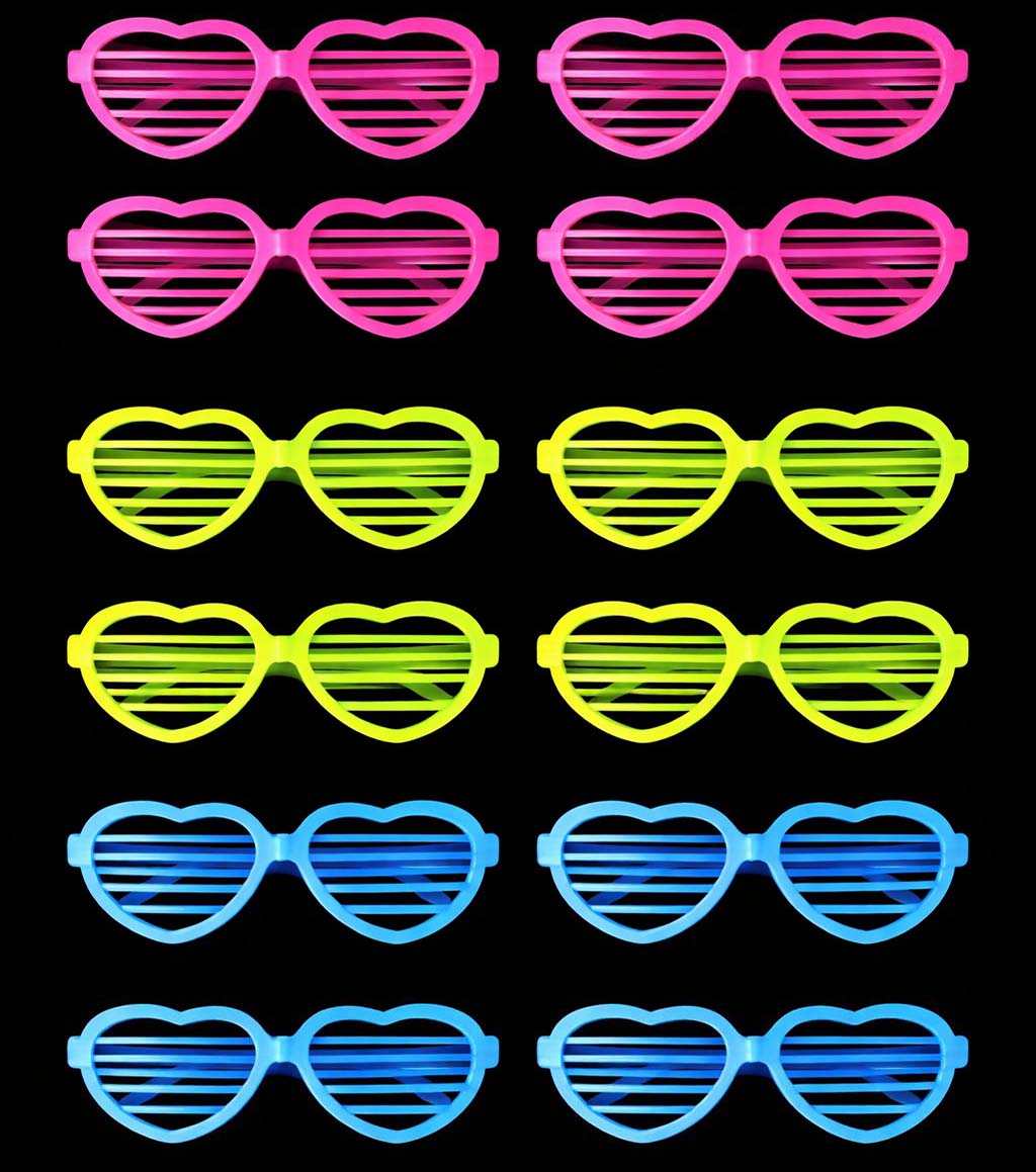 12 adet Retro Neon Fosforlu Kalp Panjur Gözlük Seti (pembe, neon yeşil ve mavi renklerden oluşan set)